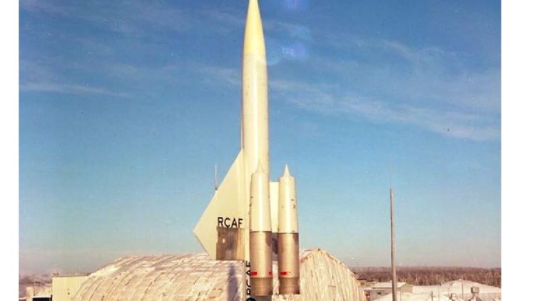 Missile américain Bomarc prêt à être lancé à la station de l’ARC de North Bay. La question des armes nucléaires et du contrôle américain sur le sol canadien, a commencé à cette date. Le missile serait lancé avec des fusées…