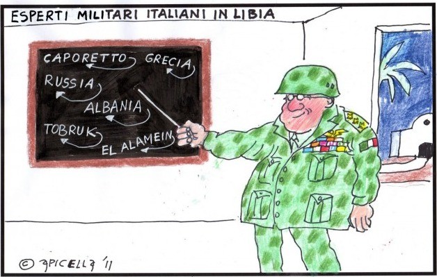 Image : « Experts militaires italiens en Libye » : sur le tableau les noms des plus célèbres défaites des armées italiennes dans les deux guerres mondiales du XXème siècle. Le premier contingent de soldats libyens qui seront formés principalement à la…