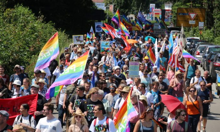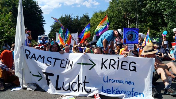 A la fin de la Semaine d’action (25-30 juin 2018) pour arrêter la base aérienne de Ramstein (Allemagne), les manifestants à l’extérieur de la base militaire ont appelé à la fin de la guerre internationale avec les drones du sol…