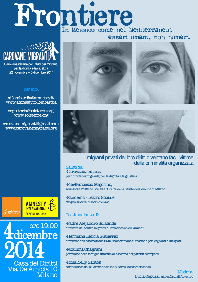 Amnesty International e Soleterre – Strategie di Pace ONLUS 4 dicembre 2014, ore 19.00 presso la Casa dei Diritti di Milano in Via De Amicis 10 invitano all’incontro FRONTIERE. IN MESSICO COME NEL MEDITERRANEO: ESSERI UMANI; NON NUMERI I migranti…