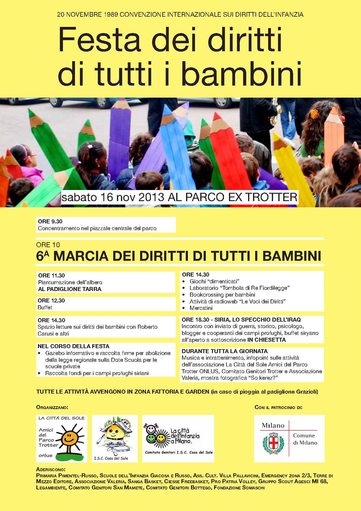 L‘Associazione “La Città del Sole – Amici del Parco Trotter” onlus, l’istituto comprensivo “Casa del Sole” e il Comitato Genitori del Trotter, con il patrocinio del Comune di Milano, organizzano la Sesta Marcia dei Diritti dei Bambini per ricordare la Convenzione ONU…