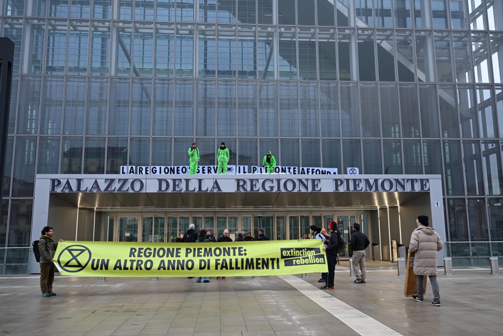 Extinction Rebellion ha incollato una maxi-scritta sulla tettoia all’ingresso del Grattacielo della Regione Piemonte: “La Regione osserva, il Piemonte affonda”, insieme a uno striscione con scritto “Un altro anno di fallimenti”. Il gesto denuncia l’assenza di azioni concrete dopo la…