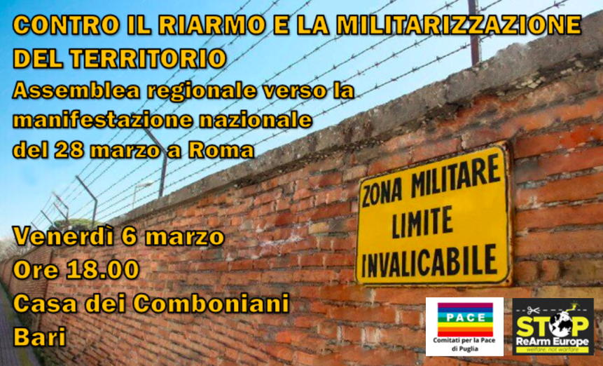 Il mondo pacifista pugliese si dà appuntamento questa sera alle ore 18 a Bari per costruire la partecipazione alla manifestazione nazionale del 28 marzo a Roma contro il riarmo e la militarizzazione del territorio. L’incontro, organizzato dalla Rete dei Comitati…