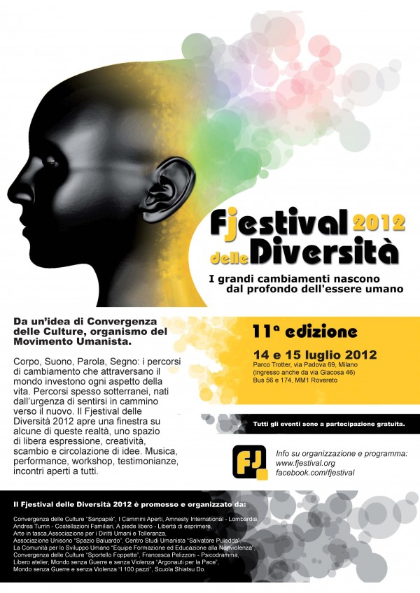 “Per definire il titolo di quest’anno siamo partiti dalla situazione che ognuno di noi stava vivendo: una forte destabilizzazione personale e sociale, unita alla preoccupazione per la crescita delle risposte violente e razziste” spiega Raffaella di Convergenza delle Culture, l’associazione promotrice di tutte le undici edizioni del Fjestival. “Così abbiamo cominciato a coinvolgere associazioni e artisti, mettendo come unici paletti la nonviolenza e il riconoscimento dell’essere umano come valore centrale. Non è stato facile – per lavorare insieme devi metterti in gioco e mantenere rapporti alla pari – ma a poco a poco si è delineato il programma e lo spirito che volevamo dare al Fjestival, poi sintetizzato nella frase: *I grandi cambiamenti nascono dal profondo dell’essere umano*. Abbiamo definito insieme gli eventi del programma, gli spazi e i nomi di personaggi famosi legati alle attività che si svolgevano nelle diverse aree – per esempio area John Lennon per gli eventi musicali, Pina Bausch per laboratori sull’espressione corporea e la danza, Lumiere per la proiezione di video e documentari, Silo per temi connessi al cambiamento sociale e personale e così via.