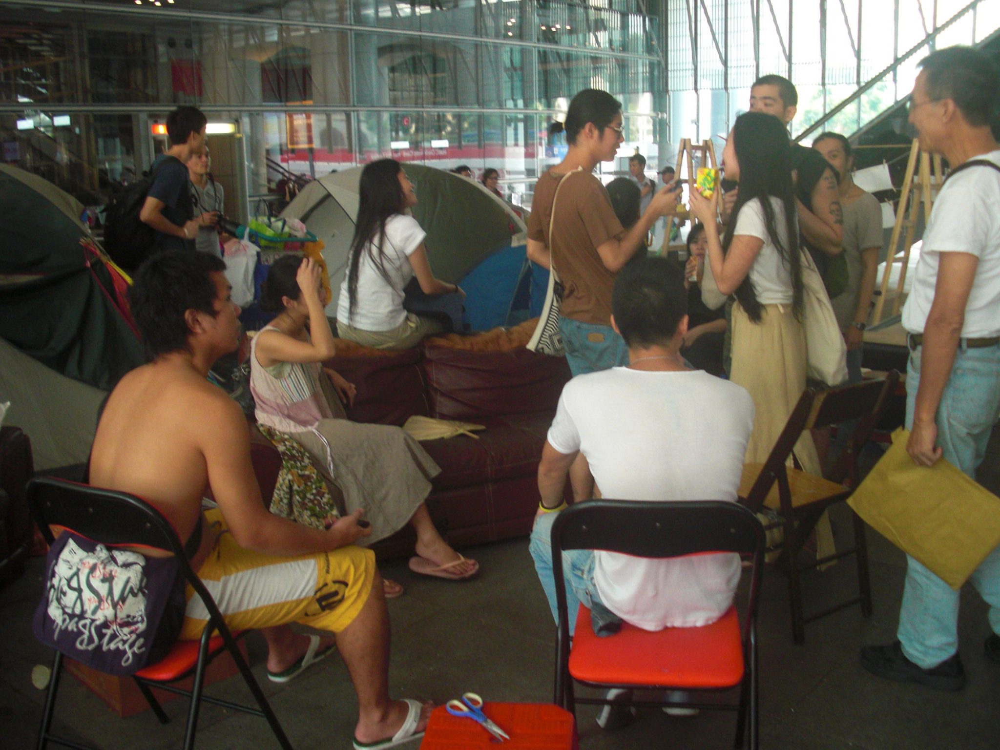 Ma gli occupanti non sono così disperati, si riuniscono e discutono in un clima di amicizia. Un momento di umanità a dimostrazione del successo: il trasloco rappresenta solo un aggiornamento. Un nucleo di individui molto motivati e diversificati – e i cinesi sono molto individualisti – avevano insieme superato incontri suscettibili di portare a divisioni. Il gruppo era sopravvissuto, intatto e pronto a continuare. Nel vento carico di polveri urbane fotografie volteggiavano nella confusione generale dei tanti oggetti accumulati nel corso dei mesi dall’inizio dell’occupazione, il 18 ottobre 2011. Cioè quando un gruppo più intraprendente aveva lasciato la bolgia della manifestazione Occupy nella zona pedonale dell’International Finance Centre per stabilire il proprio campo base nel cuore del principale responsabile del problema dell’accesso al denaro in questa città, divisa tra chi vi può accedere e chi no.