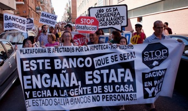 Tra il 2007 ed il 2011 in Spagna sono state prodotte più di 500.000 ordinanze di sfratto esecutivo. Ogni settimana da diverse zone del Paese giungono notizie di gente morta suicida perché stava per essere catapultata in mezzo ad una strada, perdipiù con debiti a più zeri che non sarebbe riuscita a estinguere nell’arco di una vita sola e magari senza lavoro né sussidi. Si è arrivati a tutto questo con la complicità e il lasciapassare dei governi sia del Partito Popolare (Aznar, e ora Rajoy) che del Partito Socialista (González, poi Zapatero), dalla parte di banchieri e “maghi” della finanza. Ecco perché le associazioni e i movimenti non ci stanno a sentir parlare di suicidi: «genocidio finanziario» è il termine che usano, perché si sa benissimo chi sono i responsabili e come hanno intenzionalmente agito.