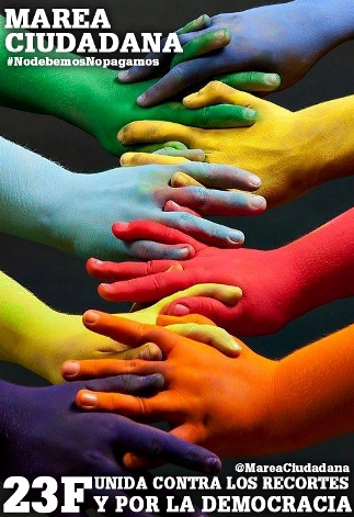 Mentre Rajoy cerca di soddisfare le necessità dei paesi europei “più avanzati”, più della metà della popolazione spagnola si mobiliterà sabato 23 febbraio 2013 partendo in pulman, auto e nave da tutti gli angoli del paese per raggiungere Madrid e protestare contro la politica di austerità e i tagli realizzati da Rajoy. Questa mobilitazione vede l’unione di tutte le “maree” (verde per l’educazione, bianca per la sanità, nera per i funzionari, ecc…) in una data speciale: il 23 febbraio è infatti l’anniversario del tentato colpo di stato all’inizio degli anni Ottanta.