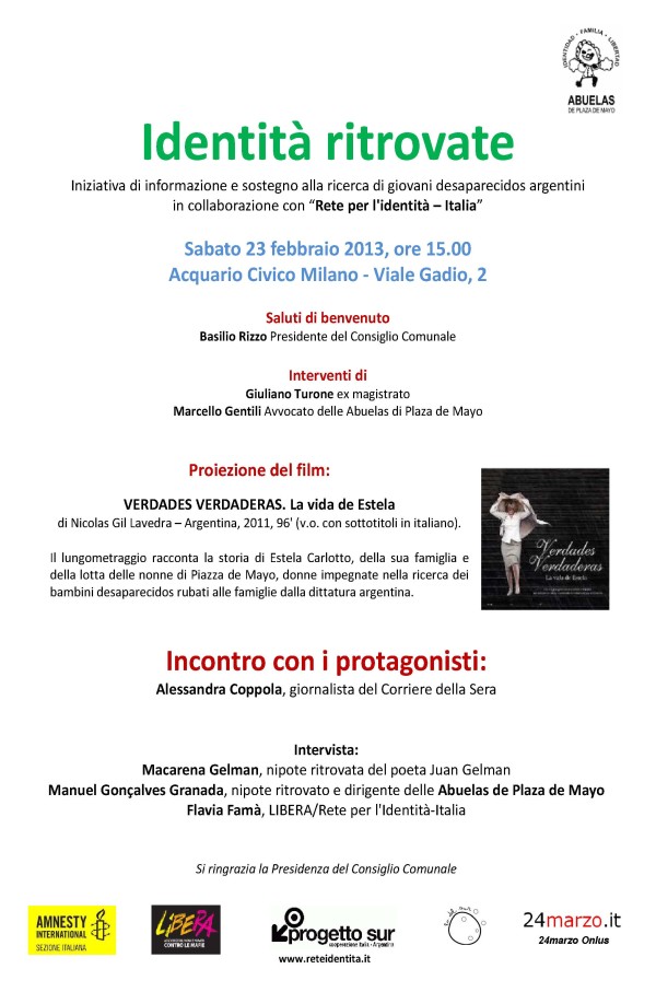 Con la collaborazione della Presidenza del Consiglio Comunale, sarà proiettato il lungometraggio che racconta la storia di Estela Carlotto, della sua famiglia e delle “Abuelas de Plaza de Mayo”, donne impegnate nella ricerca dei bambini rubati alle famiglie dalla dittatura argentina.
