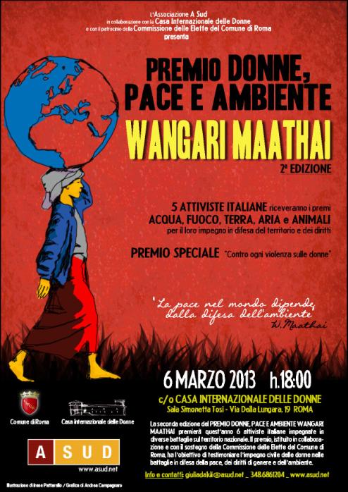 Il 6 marzo 2013, alle ore 18, presso la Casa internazionale delle donne, Sala Tosi, via della Lungara n. 19, a Roma, in collaborazione con la Casa Internazionale delle Donne e con il sostegno della Commissione delle elette del Comune di Roma, l’associazione A Sud presenta la seconda edizione del “Premio Donne, Pace e Ambiente Wangari Maathai”.