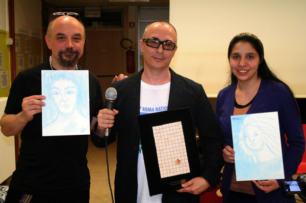 Nella foto di Steed Gamero, da sinistra: Bruno Moroni, delegato della Segreteria Nazionale Arcigay per la Visibilità e il Coming Out e Vicepresidente di Arcigay Frida Byron Ravenna, Roberto Malini con la targa a mosaico del Premio Internazionale Dan Arevalos e Rebecca Covaciu, protagonista del film-documento “La canzone di Rebecca”.