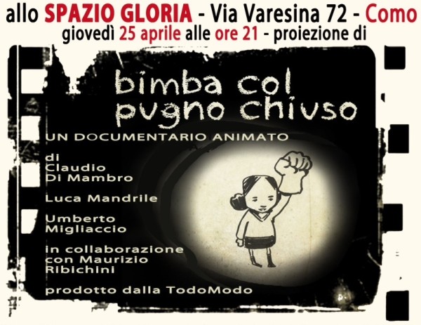 Questo documentario ha due particolarità che lo rendono unico: è animato ed è stato realizzato attraverso la modalità di produzione dal basso. A differenza del classico documentario di memorie, non si avvale di materiale di repertorio. I racconti di Giovanna sono “illustrati” da disegni ed animazioni realizzati da Maurizio Ribichini, in collaborazione con Salvo Santonocito e Adriano Mestichella. Le parole di Giovanna prendono forma attraverso il disegno e ci conducono in una nuova dimensione, dove ricordo personale e storia si fondono e confondono. “Bimba col pugno chiuso” è prodotto da 441 persone e realtà associative, sparse in tutta Italia e non solo, che hanno scelto di sostenere la sua realizzazione, attraverso la campagna di crowdfunding lanciata sul portale produzionidalbasso.com