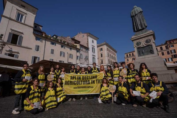 Attivisti vestiti da api in tutta Italia per dire basta alla moria delle api. Ieri mattina in 26 città italiane i volontari di Greenpeace hanno visitato mercati ed eventi con un appello: www.SalviamoLeApi.org per ricordare che la gran parte del nostro cibo dipende direttamente dall’opera di impollinazione delle api che, insieme agli altri insetti impollinatori, sono a rischio a causa di pesticidi e pratiche agricole di stampo industriale. A Roma, in piazza Campo dei Fiori, uno “sciame” composto da una ventina di attivisti in costume da api ha portato il colorato messaggio a consumatori e commercianti.
