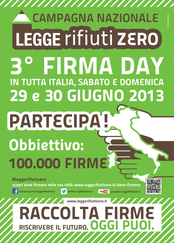 Continua in tutta Italia la raccolta delle firme per la Legge di Iniziativa Popolare Rifiuti Zero. Raggiunta la quota delle 50.000 firme necessarie a presentare la legge a settembre, il terzo Firma Day serve a raddoppiare la cifra: l’obiettivo è centomila.