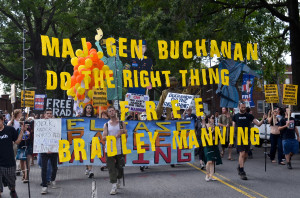Venerdì 26 luglio a Fort McNair, Washington D.C, i dimostranti hanno bloccato l’accesso all’ufficio del generale di divisione Jeffrey S. Buchanan, l’autorità militare con il potere di ridurre l’eventuale condanna di Bradley Manning. Portavano un’enorme riproduzione della Costituzione con la scritta “documento riservato”, palloncini e uno striscione con il messaggio “Generale di divisione Buchanan, fai la cosa giusta: libera Bradley Manning.”