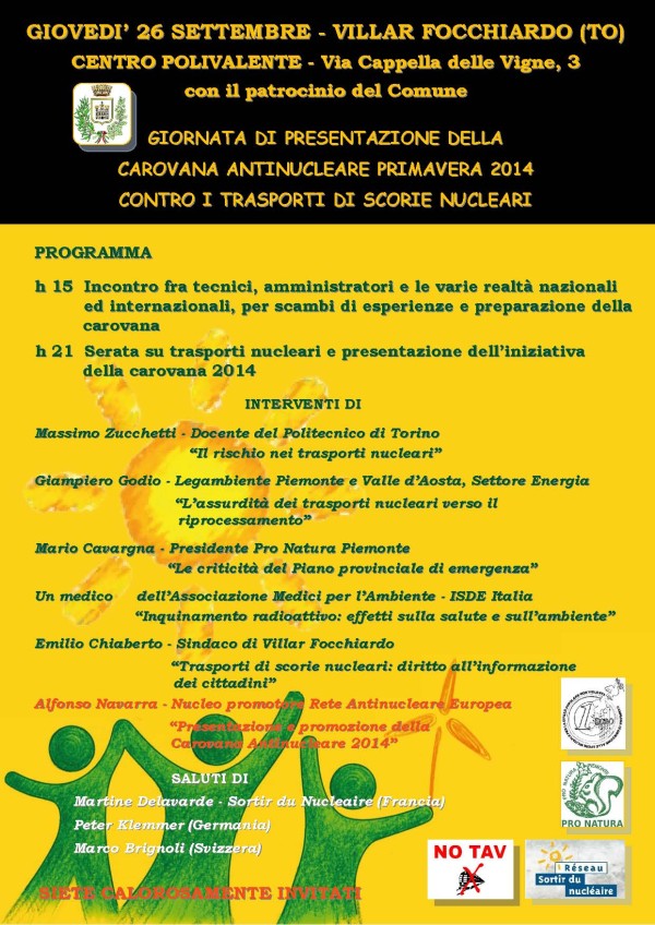 Una riunione preparatoria avrà luogo il 26 settembre 2013 a Villar Focchiardo (Valle di Susa, Italia), al Centro Polivalente, con il patrocinio del Comune, il quale ha presentato un ricorso legale per il diritto all’informazione dei cittadini in occasione dei trasporti nucleari.