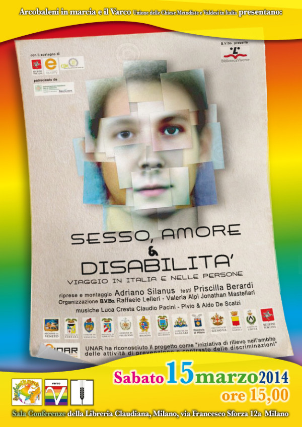 I gruppi LGBT Arcobaleni in Marcia e Varco (Unione delle Chiese Metodiste e Valdesi in Italia) presentano “Sesso, amore & disabilità”, di Adriano Silanus, Priscilla Berardi Raffaele Lelleri, Valeria Alpi, Jonathan Mastellari, film-documentario sulla vita affettiva e sessuale delle persone con disabilità fisiche e sensoriali.