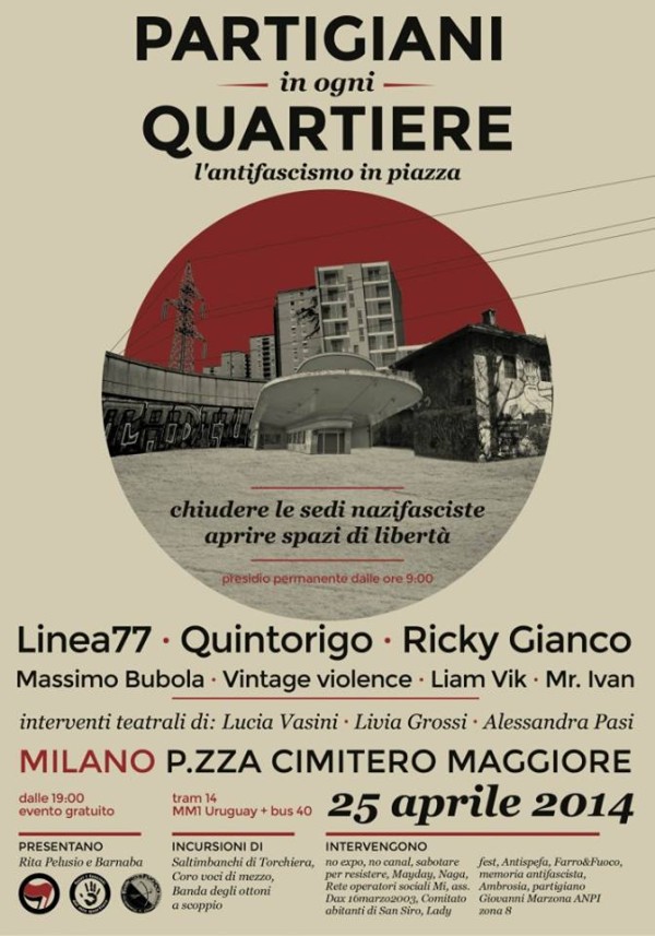 Dopo il corteo, cioè alle h. 17.00-18.00, inizia Partigiani in Ogni Quartiere, che dopo 6 anni torna in piazza Cimitero Maggiore per “chiudere le sedi nazifasciste e aprire spazi di libertà”. Ci sarà da bere e da mangiare, ci saranno musica e spettacoli. Insomma, siateci! Per stare insieme e per dire che i fascisti nel quartiere non ci possono stare.