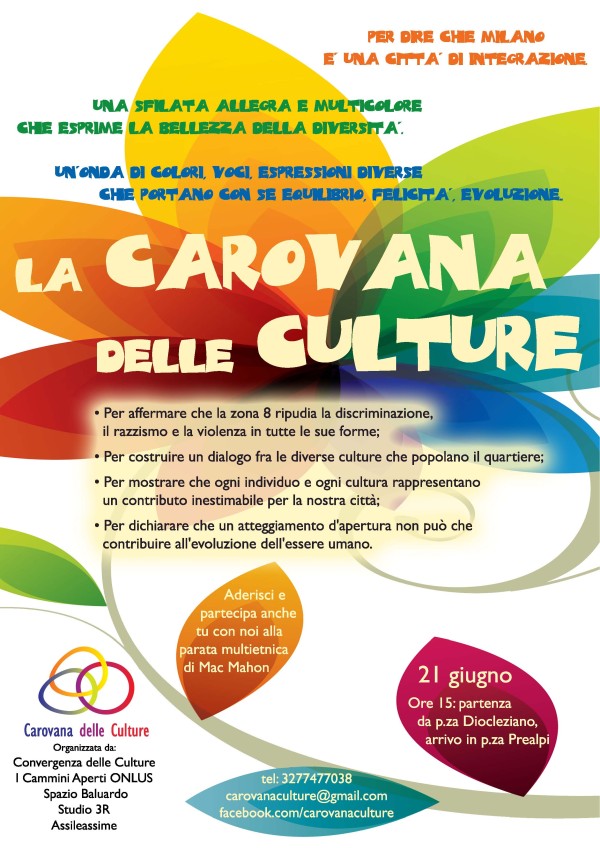 Come Convergenza delle Culture stiamo organizzando per sabato 21 giugno una Carovana delle Culture che parta alle 15 da piazza Diocleziano e arrivi fino in piazza Castelli, per poi concludersi in piazza Prealpi. L’idea è di portare in piazza i cittadini, le associazioni, le comunità di stranieri per dire che Milano è per il dialogo e l’integrazione tra culture. Vorremmo dare una risposta forte, festosa e soprattutto colorata all’ondata di razzismo che dilaga nella nostra città.
