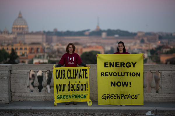 Mentre i ministri dell’energia dei Paesi del G7 sono riuniti a Roma, attivisti di Greenpeace hanno aperto un enorme striscione dalla Terrazza del Pincio, che affaccia su piazza del Popolo, con scritto “G7: go renewable, go clean & independent”, perché lo sviluppo delle fonti rinnovabili e dell’efficienza energetica è l’unica via per aumentare l’indipendenza energetica.