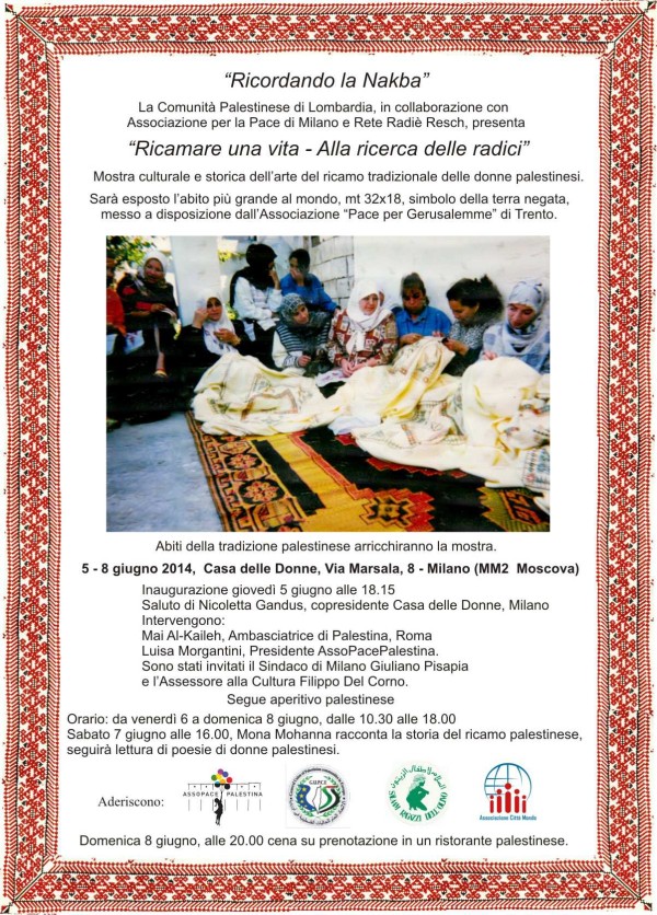 Dal 5 all’8 giugno 2014 la Casa delle Donne ospita una mostra promossa dalla Comunità Palestinese della Lombardia, con l’Associazione per la Pace di Milano e la Rete RadiéResch: “L’abito più grande del mondo, arazzi, ricami, fotografie, video in una mostra sull’arte femminile della tradizione in Palestina”.
