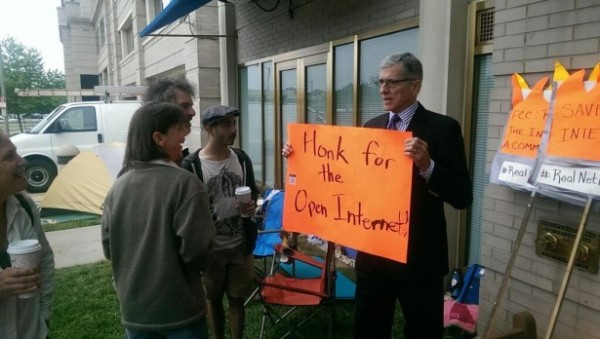 Il presidente della Federal Communications Commission (FCC) Tom Wheeler regge un cartello durante l’incontro con gli attivisti dell’accampamento “Occupy the FCC”. Le regole da lui proposte per aprire Internet non sono comunque sufficienti per salvaguardare la neutralità della rete. (Fight for the Future)