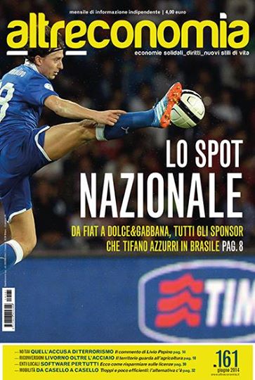 Altreconomia dedica la copertina del numero di giugno 161 alla Nazionale, che il 14 giugno 2014 gioca la prima partita ai mondiali di calcio: l’Italia vola in Brasile con 21 “tifosi” al seguito, sponsor che nel 2012 hanno garantito quasi 40 milioni di euro di finanziamento alla federazione italiana gioco calcio (FIGC).