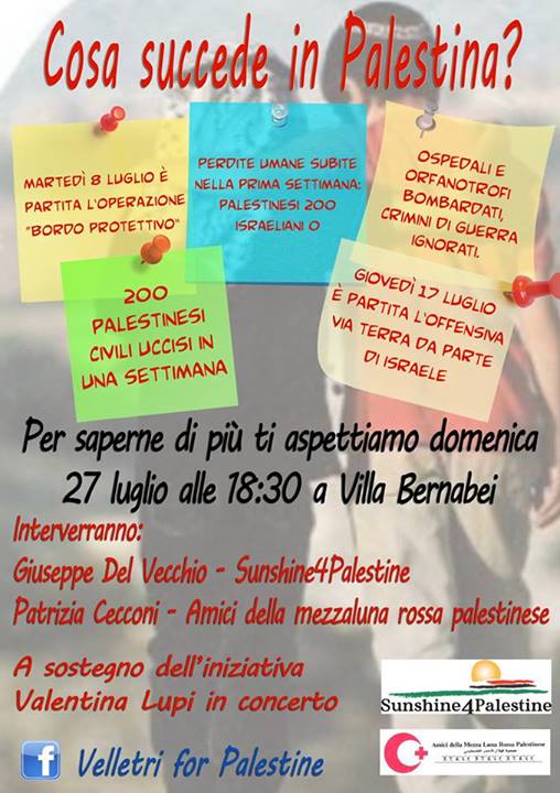 Lo faremo attraverso un incontro che si terrà domenica 27 luglio a Villa Bernabei a Velletri (RM), in cui si potrà discutere insieme e ascoltare gli interventi di esperti della questione israelo-palestinese, che risponderanno alle nostre domande e ci faranno comprendere le reali condizioni in cui verte il Medio Oriente.