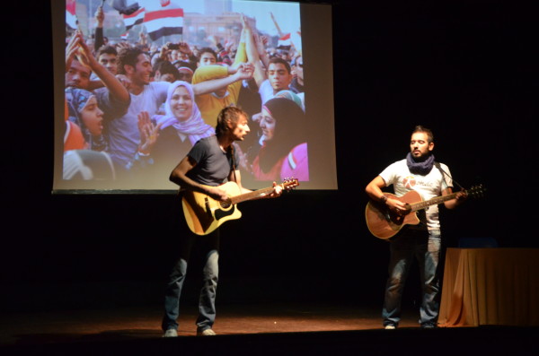 Poi si alza il sipario ed entra in scena la “Rivoluzione dei Gelsomini” in Tunisia, attraverso le parole di una blogger che vi partecipa direttamente e la reazioni di una coppia di italiani che segue trepidante gli eventi. Le immagini delle manifestazioni e le frasi ispiratrici proiettate su uno schermo si alternano a momenti musicali con chitarre e bonghi, in un ritmo serrato e coinvolgente. E’ davvero emozionante per una persona come me, che ha vissuto da liceale l’esaltante stagione degli anni Settanta, sentire giovani che all’epoca non erano neanche nati cantare “Libertà è partecipazione” di Gaber e vedere ragazzi ancora più piccoli applaudire con foga. E gli applausi si ripetono per tutto lo spettacolo, fino al trascinante finale scandito dalle mani che battono tutte insieme, a sottolineare il messaggio che “la ragazza dei gelsomini siamo tutti noi!”. Il pubblico sommerge di entusiasmo Stefano, Diego, Moreno, Doris, Laura e Alessandro, i giovani volontari che hanno messo in scena la storia della rivoluzione nonviolenta in Tunisia. Nessuno di loro è un professionista e ognuno ha contribuito con le sue capacità e le sue passioni alla riuscita dello spettacolo.