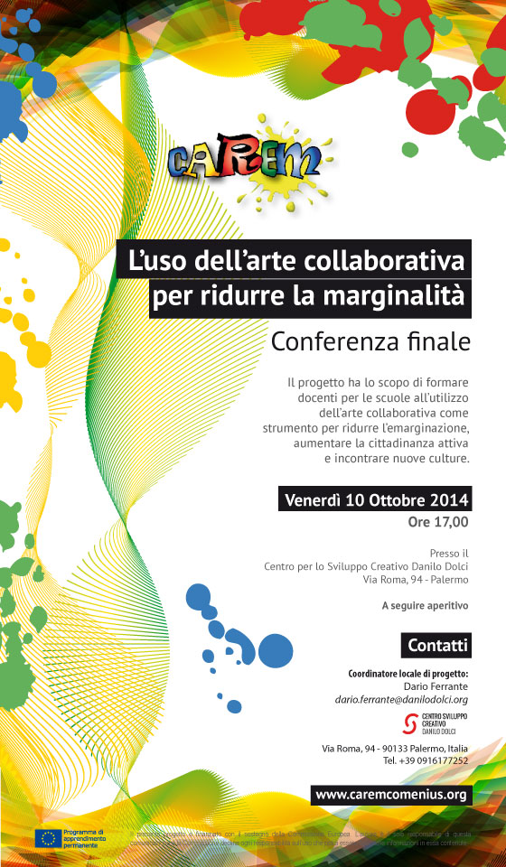 La Conferenza ha lo scopo di informare il pubblico sui contenuti e gli obiettivi raggiunti dal progetto, il cui scopo è quello di formare insegnanti e alunni alla luce della metodologia dell’educazione non-formale dell’arte collaborativa come strumento per ridurre l’emarginazione, aumentare la cittadinanza attiva e incontrare nuove culture.