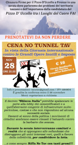Il 28 novembre si terrà la serata di chiusura firme in concomitanza con un’iniziativa organizzata dagli amici del NO TUNNEL TAV di Firenze. Una serata di raccolta fondi, dove affronteremo le problematiche del territorio toscano. In vista della Giornata internazionale delle grandi opere inutili ed imposte che si celebrerà l’8 dicembre. Per chi vuole firmare può farlo a questo link.