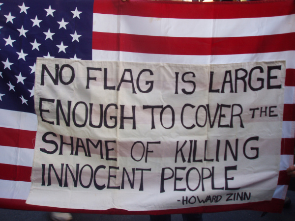 Nella foto: una frase dello storico americano Howard Zinn “nessuna bandiera è grande abbastanza per coprire la vergogna dell’uccisione di persone innocenti”.