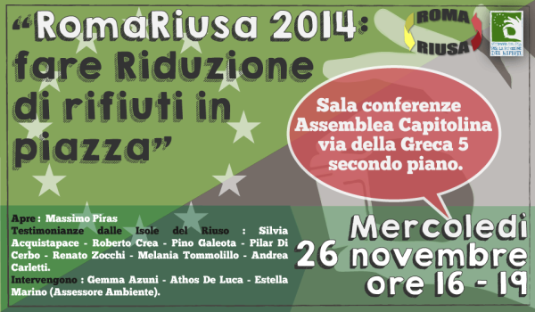 Mercoledì 26 novembre alle ore 16, nell’ambito della Settimana Europea della Riduzione del Rifiuto si terrà il convegno “RomaRiusa: fare Riduzione dei rifiuti in piazza”, progetto che vuole anticipare la costituzione di nuovi Centri di Riuso e Riparazione in tutti i Municipi, come previsto nella delibera di iniziativa popolare “Roma verso Rifiuti Zero” oggetto di un tavolo tecnico di condivisione con l’assessorato ambiente di RomaCapitale, e successivamente tradotta in delibera di giunta del 9 luglio.