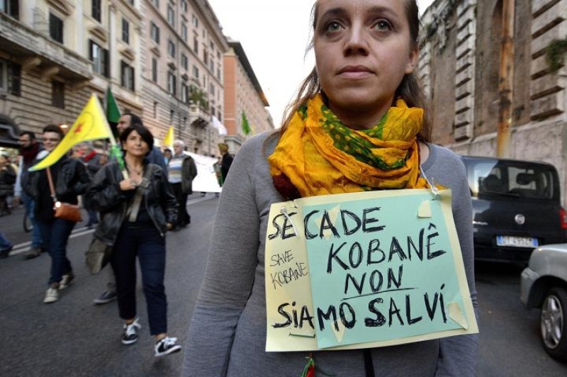 In occasione della Giornata globale di sostegno alla resistenza di Kobane, ieri pomeriggio si sono tenuti cortei di solidarietà in Turchia e in diverse città italiane ed europee. A Roma lo slogan del corteo gridava: “Roma con Kobane! Kobane resisti”. Il corteo romano ha voluto sostenere attivamente la resistenza di Kobane coinvolgendo i cittadini e le realtà politiche e sociali sostenendo il popolo curdo anche attraverso una raccolta di fondi e di medicine, e attraverso l’invio di volontari sanitari e di osservatori umanitari a Suruç, una città curda in Turchia dove sono accampati ora i profughi di Kobane.