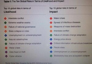 Il 15 gennaio 2015 è stata presentata a Londra la decima edizione del rapporto Global Risks 2015 realizzato dal World Economic Forum. Il report, che è il risultato di studi e pareri di 900 analisti ed esperti di vari ambiti e paesi, valuta annualmente i principali rischi mondiali sotto due prospettive, quella legata alla loro probabilità di avverarsi e l’altra legata all’impatto potenziale che potrebbero avere in un orizzonte temporale di dieci anni.
