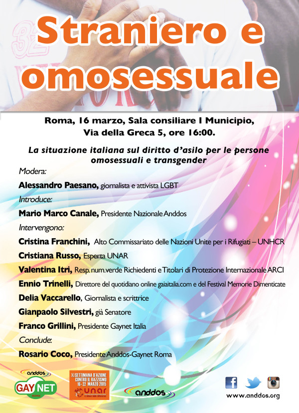 In occasione della settimana contro il razzismo promossa dall’UNAR, lunedì 16 marzo 2015 alle ore 16 si terrà presso i locali del I Municipio in via della Greca 5, Roma, una tavola rotonda dal titolo “Straniero e omosessuale”, sul diritto d’asilo per le persone omosessuali e transgender, organizzata da Anddos e dal circolo Anddos-Gaynet Roma.