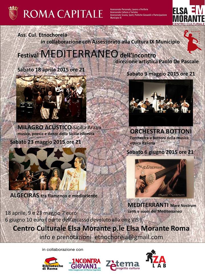 Prodotto dall’Ass. Etnochoreia e la direzione artistica di Paolo De Pascale, con il sostegno di Zetema e del Municipio IX, gli appuntamenti – sempre di sabato sera al Centro Culturale Elsa Morante (Eur Laurentino) – proseguiranno con Orchestra Bottoni sabato 9 maggio, Algericas Flamenco sabato 23 maggio e I Mediterranti, sabato 6 giugno.