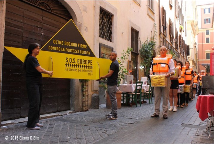 Gli attivisti si sono raccolti a Roma, in piazza della Rotonda, davanti al Pantheon, intorno alla riproduzione di una barca, simbolo del mezzo con cui nei primi sei mesi del 2015 oltre 70.000 migranti e richiedenti asilo sono arrivati in Italia in cerca di salvezza. I partecipanti hanno indossato giubbotti di salvataggio a ricordare l’importanza della prima operazione europea di ricerca e soccorso in mare, promossa in sede europea dall’Italia, grazie alla quale si è registrata una marcata diminuzione del numero di morti in mare.