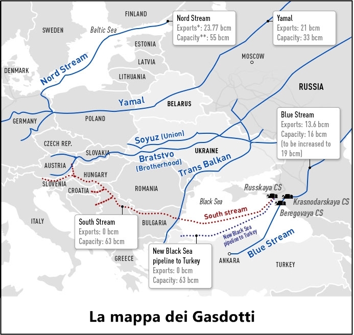 Come numerosi sono stati i progetti portati avanti per la realizzazione di svariati gasdotti per rifornire di gas russo l’Europa, l’Asia e alcuni paesi del Medioriente: