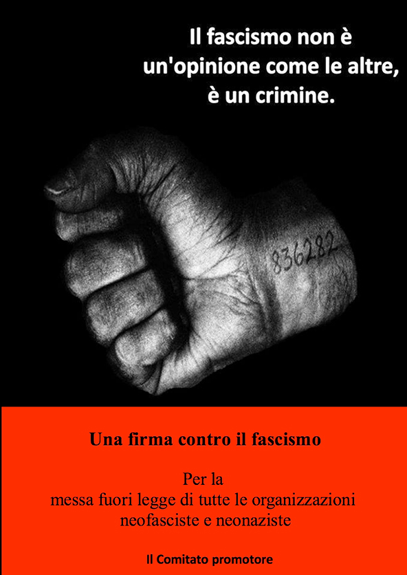 È partita la campagna per lo scioglimento delle organizzazioni neofasciste e neonaziste. Da subito è dunque possibile firmare on line la petizione ospitata sulla piattaforma change.org. La forma è quella di una lettera al Presidente della Repubblica e ai Presidenti di Camera e Senato, la sostanza è quella di sollevare con forza il problema della sempre più ampia tolleranza e legittimazione istituzionale di cui godono le tesi e i gruppi nazifascisti nel nostro paese. E l’obiettivo immediato è quello di superare le 100mila firme entro aprile.