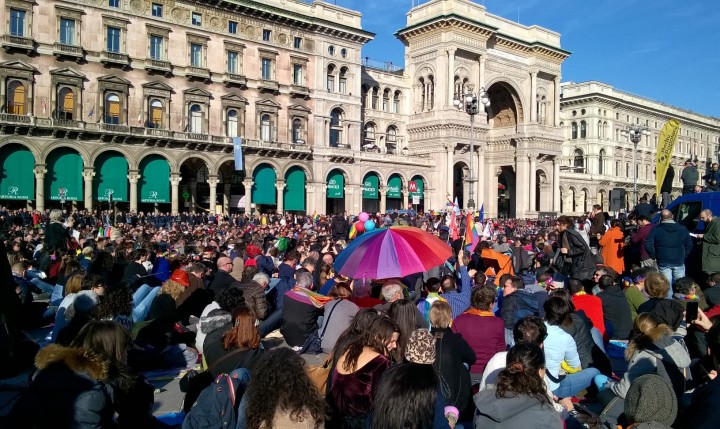 Il flash mob “Tempo scaduto” promosso dai Sentinelli di Milano si è svolto oggi in Piazza Duomo sotto un sole primaverile: migliaia di persone si sono sedute sul sagrato e poi sdraiate al suono di una sirena per simboleggiare lo sfinimento davanti agli ignobili tira e molla della politica e la morte dei diritti. Tre minuti di silenzio, in sintonia con altre piazze (Torino, Palermo, Londra), poi tutti si sono rialzati in uno sventolio di bandiere dai colori dell’arcobaleno.