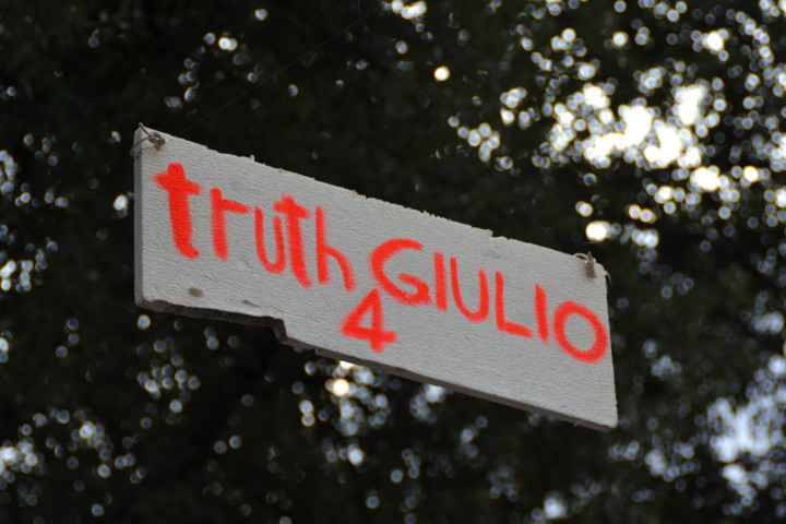 Numerose le immagini del giovane ricercatore ucciso, presente in foto, dipinti e striscioni retti dai partecipanti.