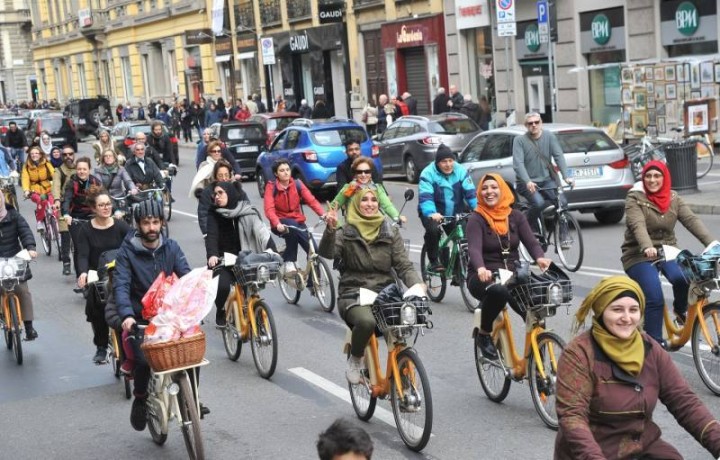 Otto chilometri in bicicletta, da via Padova a Porta Venezia: molte le donne musulmane, con o senza velo, che domenica 13 marzo nel pomeriggio hanno aderito alla pedalata contro la discriminazione di genere e la violenza sulle donne.
