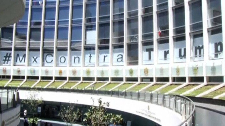 Senatori messicani hanno appeso uno striscione anti-Trump fuori dalla sede del Senato a Città del Messico, in segno di protesta per le posizioni del candidato repubblicano, che ha definito i messicani degli stupratori e promette di far pagare al paese il muro lungo la frontiera.