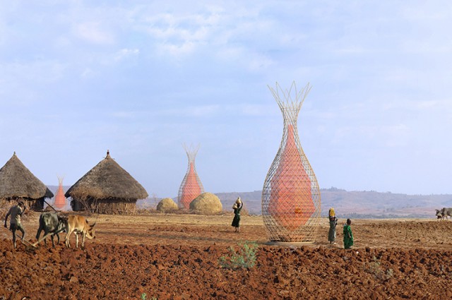 L’idea alla base del concetto di Warka Water è quella di costruire torri che ospitano una rete di plastica. Al calare della temperatura, durante la notte, l’acqua si condensa nella rete e rotola giù in un serbatoio sul fondo della torre. L’ampia superficie delle reti permette una sufficiente raccolta d’acqua nelle condizioni desertiche dei luoghi in cui la struttura è destinata, ad esempio in Namibia. L’utilizzo di una rete piuttosto che di una superficie solida permette all’aria di circolare, portando così anche più acqua. La torre Warka Water prende il nome da un albero di fico nativo dell’Etiopia, e deve il suo successo alle notevoli differenze di temperatura tipiche dei deserti.