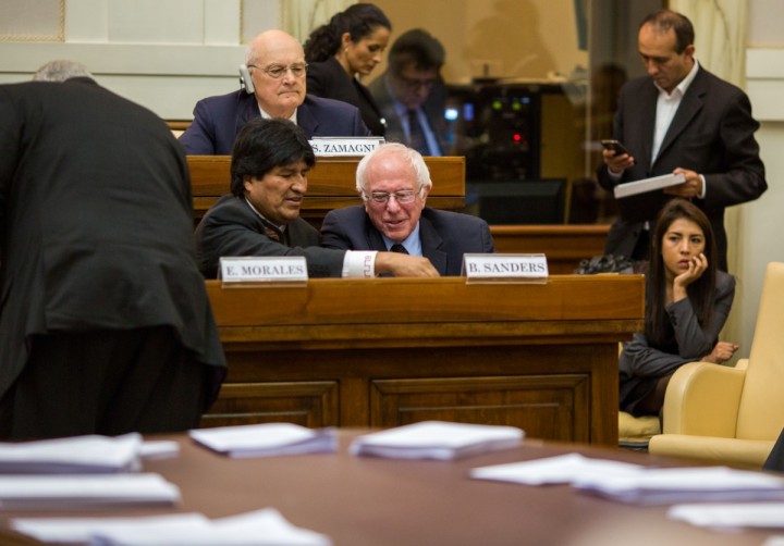 Venerdì 15 aprile Bernie Sanders è intervenuto in Vaticano a una conferenza sulla giustizia sociale e la sostenibilità ambientale, nel venticinquesimo anniversario dell’enciclica “Centesimus Annus” di Papa Giovanni Paolo II, con il presidente boliviano Evo Morales e quello ecuadoriano Rafael Correa.