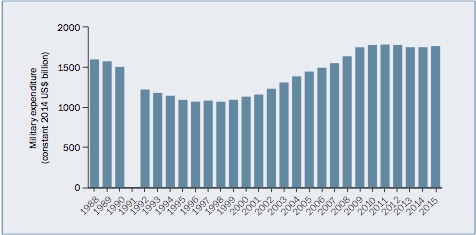 Pubblicati i dati SIPRI relativi al 2015: il totale dei fondi destinati ad armi ed eserciti cresciuto dell’1% in termini reali. Dopo tre anni di stasi riprende la crescita iniziata nel 2001.