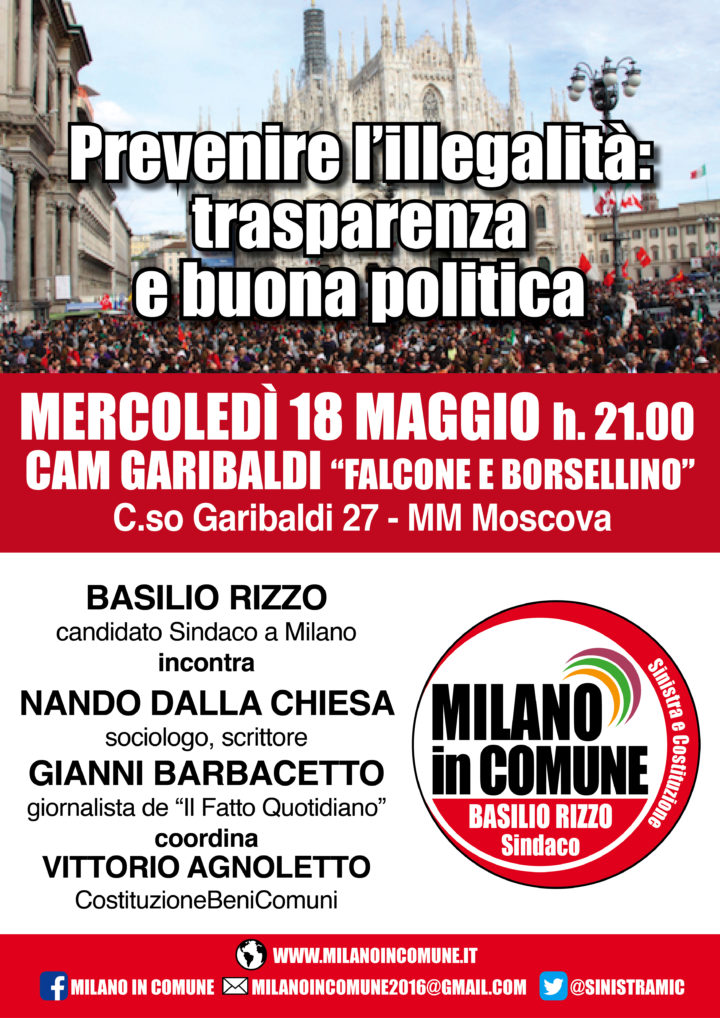 “Prevenire l’illegalità: trasparenza e buona politica” è il titolo del dibattito coordinato da Vittorio Agnoletto che si terrà mercoledì 18 maggio a Milano al CAM di c.so Garibaldi 27, al quale parteciperanno: Basilio Rizzo, candidato sindaco e protagonista da oltre trent’anni, da “Mani Pulite” ad oggi, nella lotta alla corruzione e all’illegalità istituzionale, Nando Dalla Chiesa, sociologo e il giornalista Gianni Barbacetto. Un’occasione per tutti i milanesi per ragionare sul nostro recente passato e per progettare il futuro.