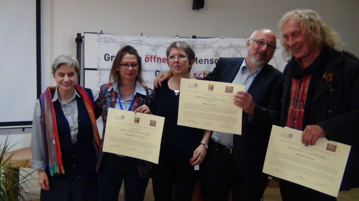 Il pomeriggio invece è stato dedicato alla premiazione dei Dottori Honoris Causa in Utopia 2016: quest’anno il riconoscimento è andato a New Hope, una cooperativa sociale di donne italiane e donne migranti ex-vittime della tratta, che ha creato a Caserta un laboratorio di sartoria etnica, “per il coraggio e la capacità di trasformare il sogno di un’esperienza di lavoro e di economia sociale in un segno concreto di speranza”; al pacifista tedesco Juergen Graesslin “per l’impegno coraggioso profuso da anni per scoperchiare lo scandalo del mercato delle armi”; al maestro vetraio, scrittore, poeta e regista belga Bernard Tirtiaux “per la varietà eccezionale della sua creatività artistica… per la carica utopica che le sue opere diffondono… e per il grande rispetto e amore per la vita”.