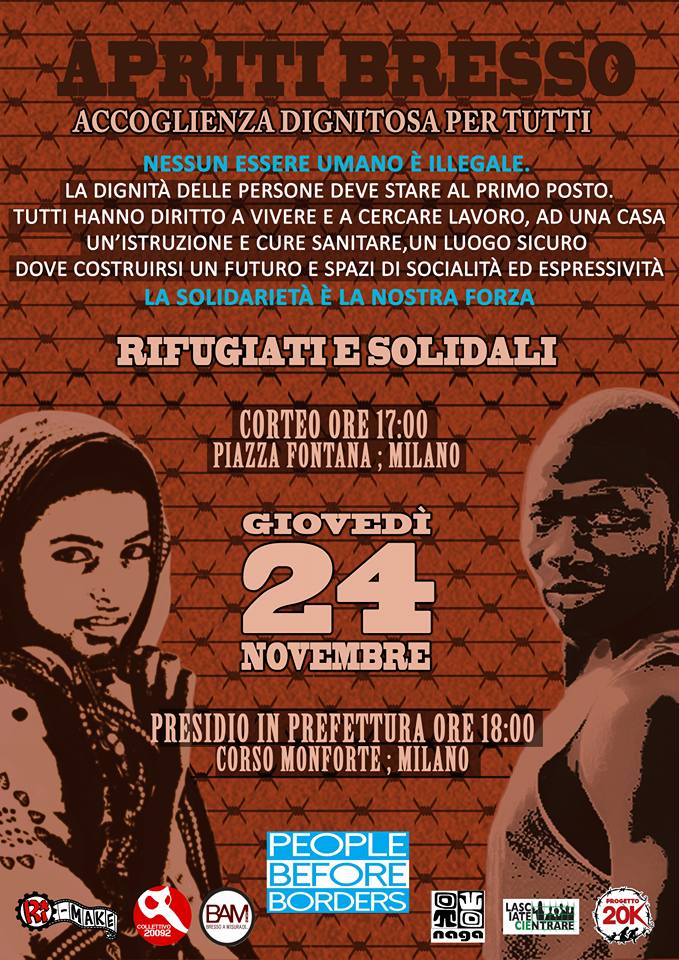 Per questo ci uniamo agli ospiti del Centro di Bresso per una manifestazione il 24 novembre 2016; il ritrovo è fissato per le 17.00 in piazza Fontana, da dove ci muoveremo insieme verso la Prefettura di Milano, in corso Monforte 31, rimanendo poi in presidio davanti alla stessa a partire dalle 18.00.