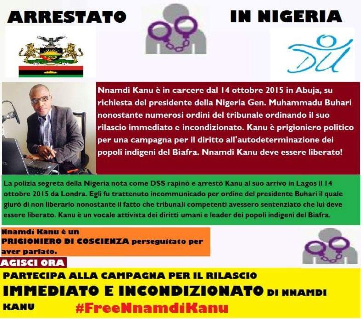 Nnamdi Kanu è un cittadino britannico, in carcere dal 14 ottobre 2015 ad Abuja, la capitale della Nigeria per volontà del presidente, il Generale Muhammadu Buhari, nonostante le numerose ordinanze del tribunale che richiede il suo rilascio immediato e incondizionato. Kanu è prigioniero politico perché porta avanti la campagna per il diritto all’autodeterminazione dei popoli indigeni del Biafra. La polizia segreta della Nigeria nota come DSS ha rapito e arrestato Kanu al suo arrivo a Lagos il 14 ottobre 2015 da Londra. Egli venne falsamente accusato di tradimento e trattenuto per ordine del presidente Buhari il quale giurò di permetterne la liberazione nonostante il fatto che tribunali competenti avessero sentenziato che lui non potesse essere detenuto. Kanu è attivista dei diritti umani e leader dei popoli indigeni del Biafra (IPOB).